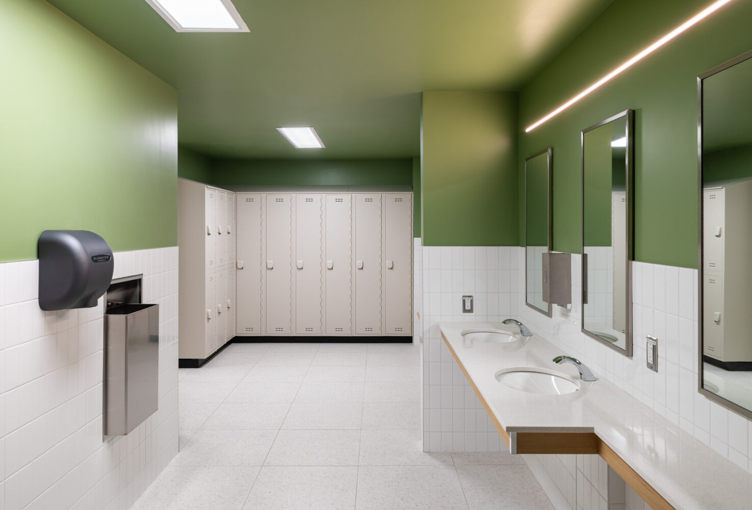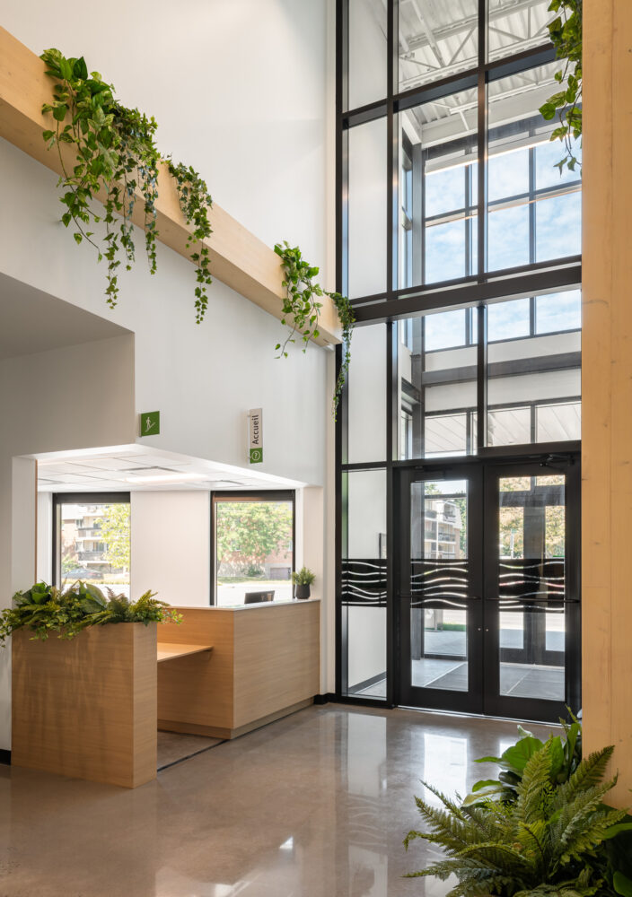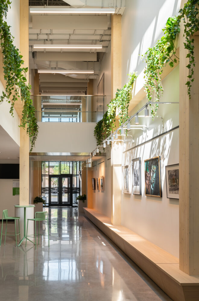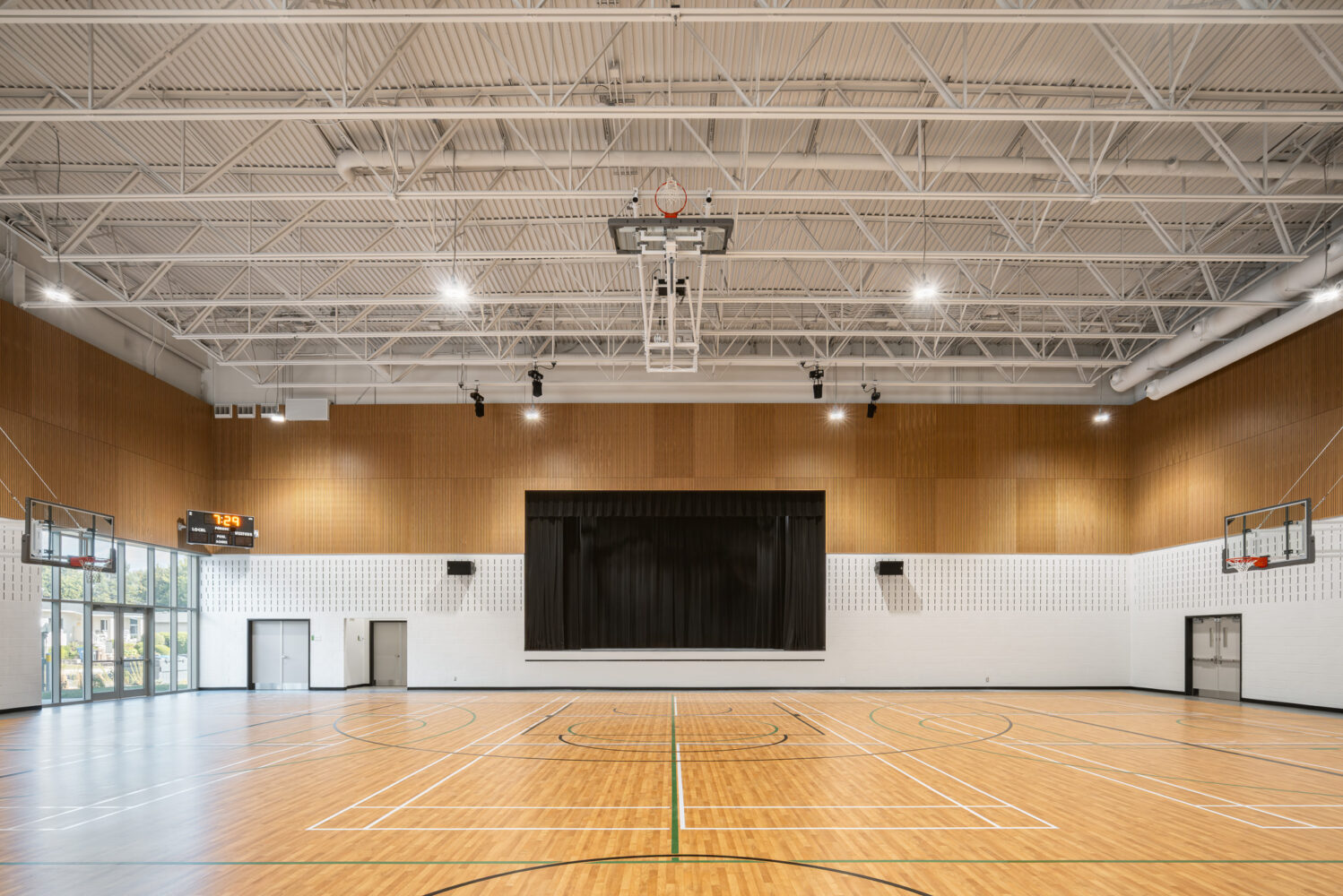 Le nouveau bâtiment inclut entre autres un gymnase double pouvant être aménagé en salle de réception, plusieurs salles pour des activités variées (danse, musique, arts, etc.), une cuisine pour traiteur pouvant être utilisée également pour des ateliers de cuisine, une salle à manger de type bistro, une salle récréative avec des tables de billard ainsi qu’une terrasse sur le toit. Il possède également un comptoir d’accueil, d’une infirmerie, de salles de toilettes et de vestiaires. Le tout est évidemment accessible aux personnes à mobilités réduites. Un grand hall vitré prédomine le corridor central apportant une belle luminosité. Les couleurs, textures et touches de verdure en font un lieu clair, apaisant et accueillant.